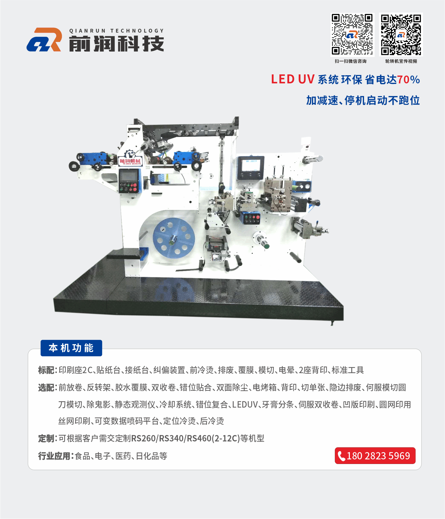 主營設備商標印刷機、衛星式輪轉印刷機、模切機 等產品,公司可為客戶量身制定商標機、輪轉機等自動化解決方案。公司有強大的研發體系,確保能為客戶量身定制各類非標且最有價值的產品;前潤機械在國內外擁有極高的市場占有率及良好的信譽,贏得了眾多知名企業的青睞與合作,產品暢銷多個國家和地區,市場銷量近萬臺;我們愿與您攜手合作,建立長久雙贏機制,共享成功喜悅!加盟熱線:133 2260 8282